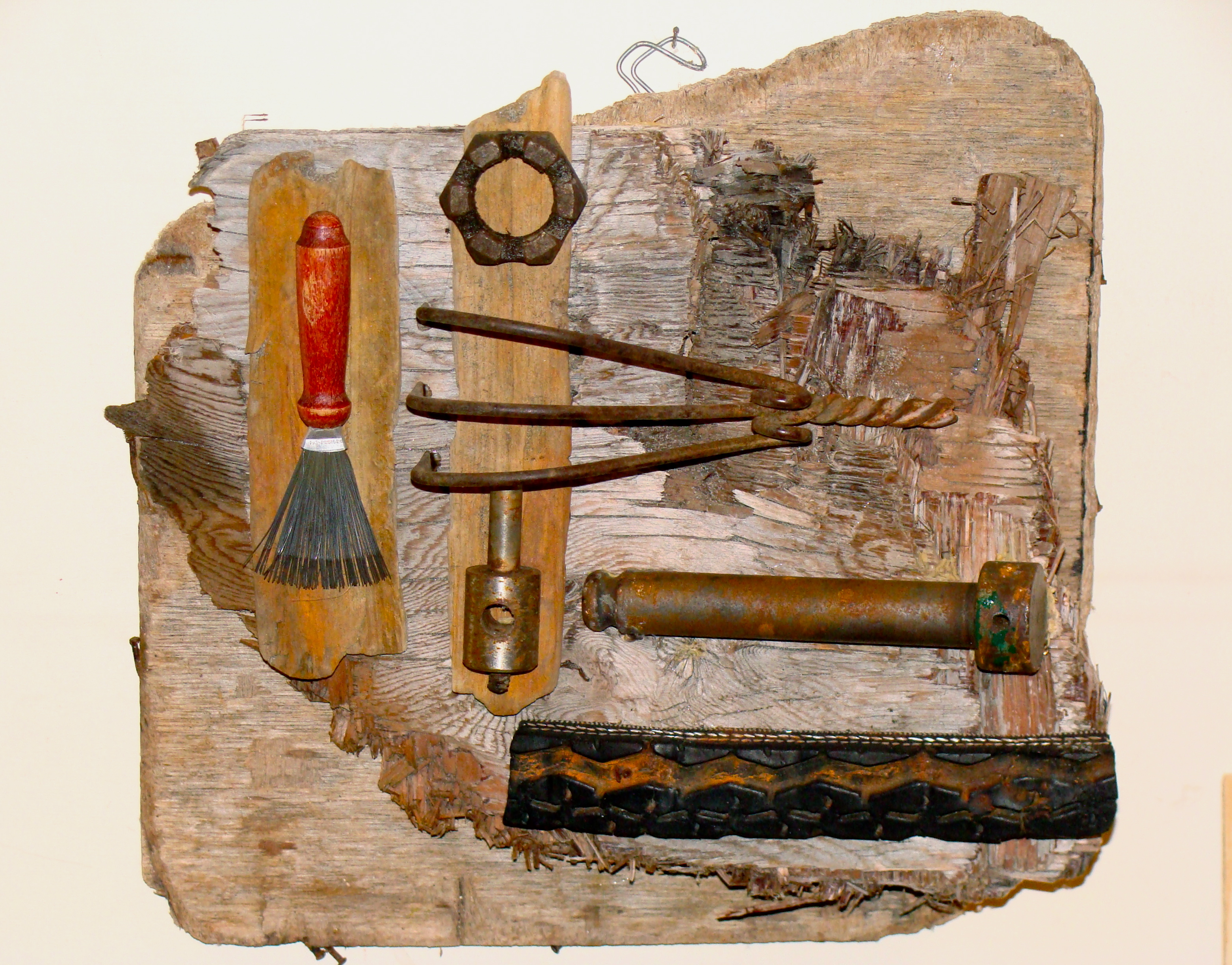 Wood sculpture, metal and mixed media assemblage, collage