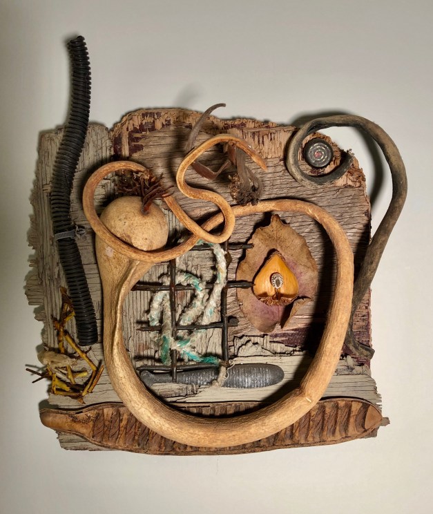 Wood sculpture, metal and mixed media assemblage, collage