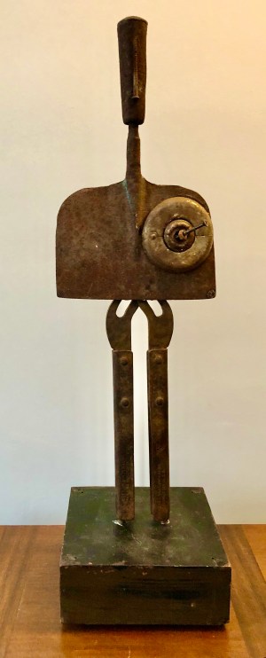 Wood sculpture, metal and mixed media assemblage, collage