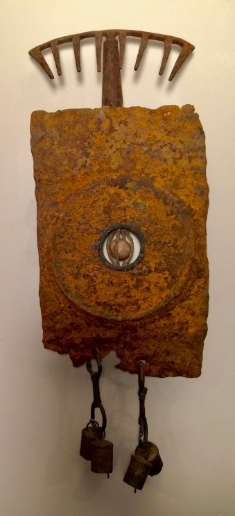 Wood sculpture, metal and mixed media assemblage, collage